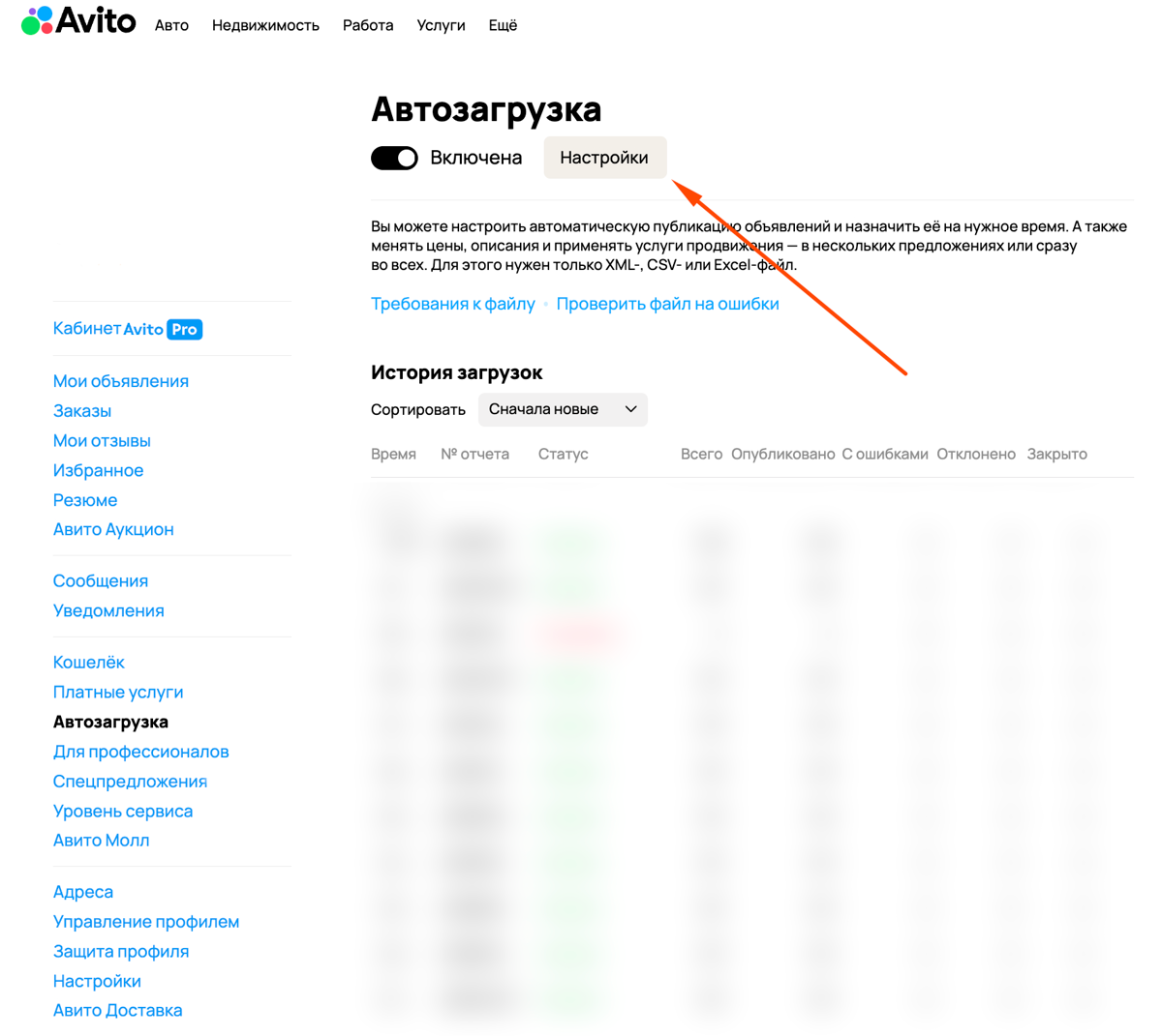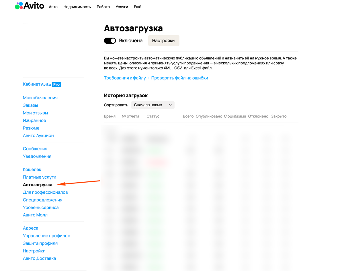 Для настройки автозагрузки необходимо зайти в личный кабинет Avito и перейти в раздел "Автозагрузка", как показано на скриншоте ниже.