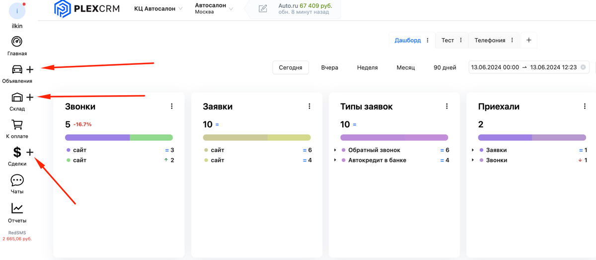 - Кнопки "Создать объявление", "Создать машину на складе" и "Создать сделку" были перемещены в соответствующие блоки. Теперь для создания необходимо нажать на "+" напротив нужного блока.