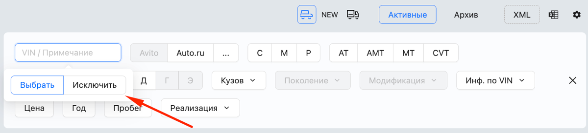 - В поле "VIN / Примечание" введите примечание, которое хотите исключить из поиска.