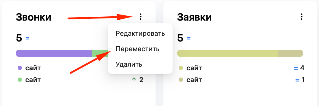 - В новом дашборде можно создавать новые виджеты или переносить их из других дашбордов. Для переноса виджета нажмите на три точки рядом с названием виджета, выберите "Переместить" и укажите целевой дашборд.