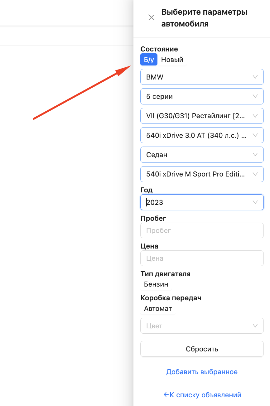 1. Ручное добавление автомобиля: При ручном добавлении автомобиля теперь можно выбрать его состояние: "Б/у" или "Новый".