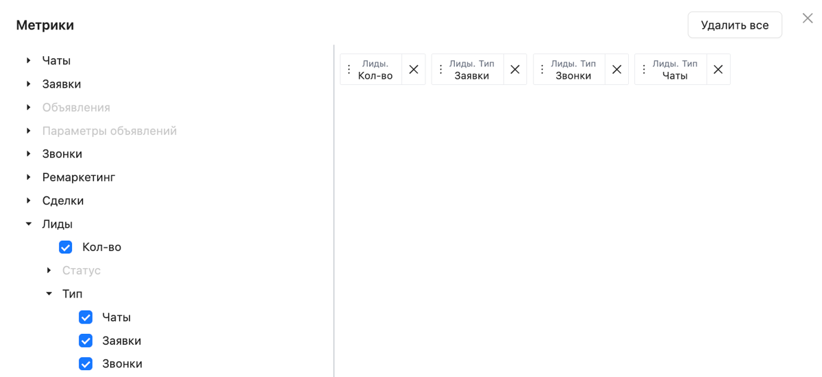 - Лиды по чатам: Число лидов, полученных через онлайн-чаты. Данная метрика важна для анализа использования онлайн-чатов в процессе привлечения лидов.