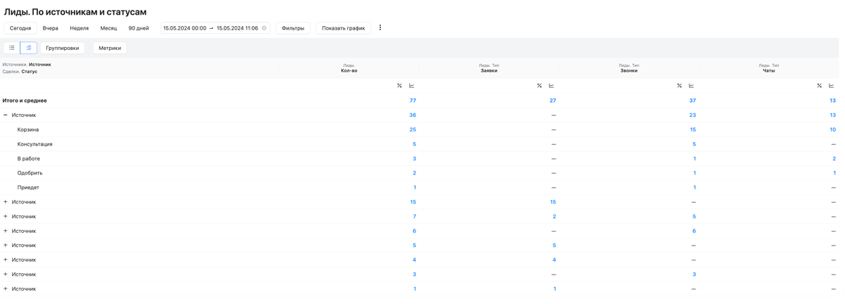 - Количество лидов: Общее число лидов для данной комбинации источника и статуса. Эта метрика помогает понять, сколько всего лидов было получено из данного источника и в каком статусе они находятся.