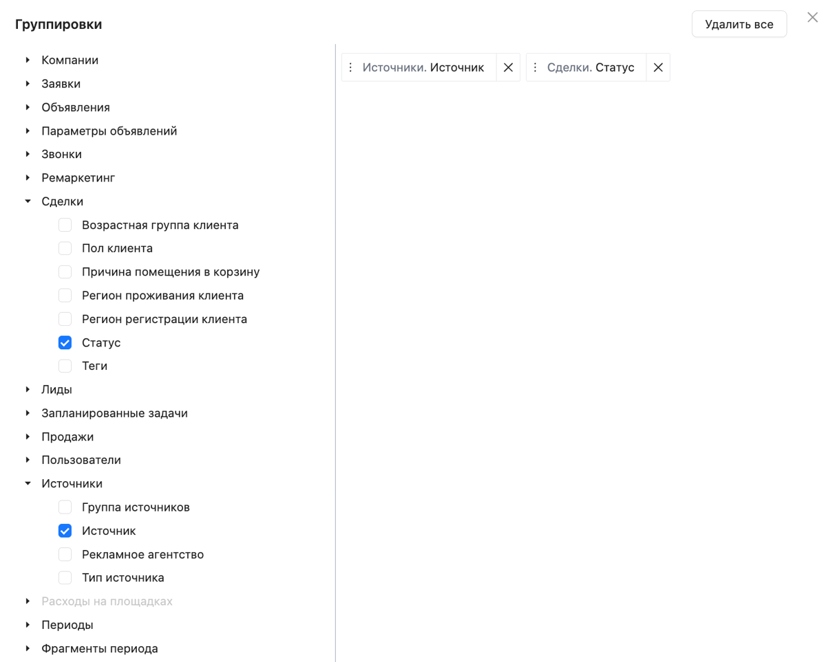 - Количество лидов - общее число лидов для данной комбинации источника и статуса.