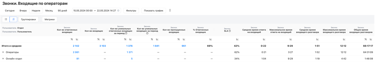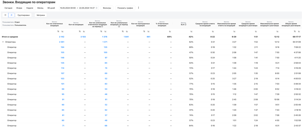 Отчет "Звонки. Входящие по операторам" предоставляет информацию о работе операторов за заданный в отчете период . Включает данные о количестве звонков, времени ответов и продолжительности разговоров. В отчете используются группировки и метрики, описанные ниже.