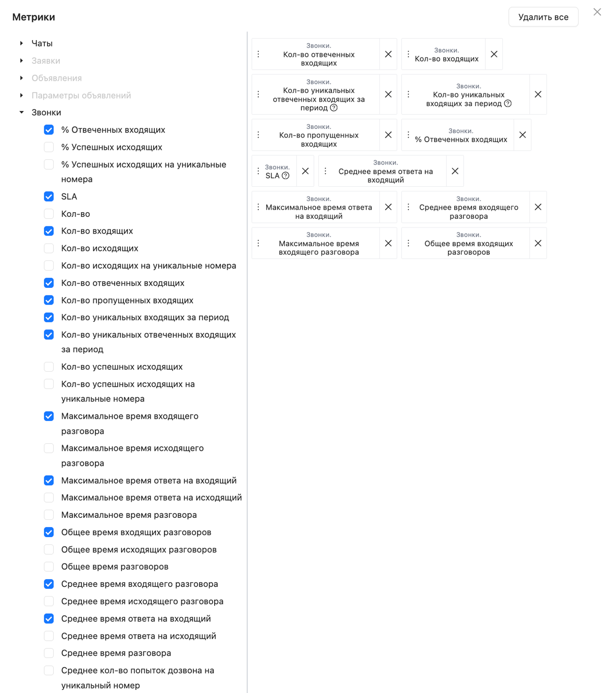 • Звонки. Кол-во отвеченных входящих: Количество входящих звонков, на которые был дан ответ.