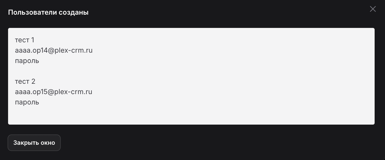 - Завершение процесса: После ввода данных для всех пользователей нажмите кнопку «Отправить». Система создаст всех указанных пользователей и отобразит их основные данные: имя, логин и пароль.