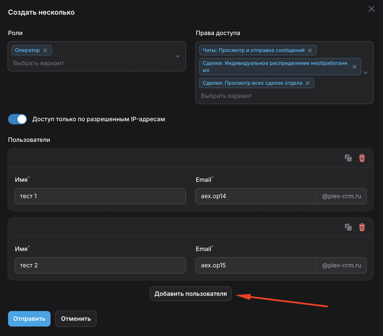 - Изначально форма предназначена для создания одного пользователя. Для добавления дополнительных записей нажмите «Добавить пользователя» (см. скриншот, отмеченный красной стрелкой).