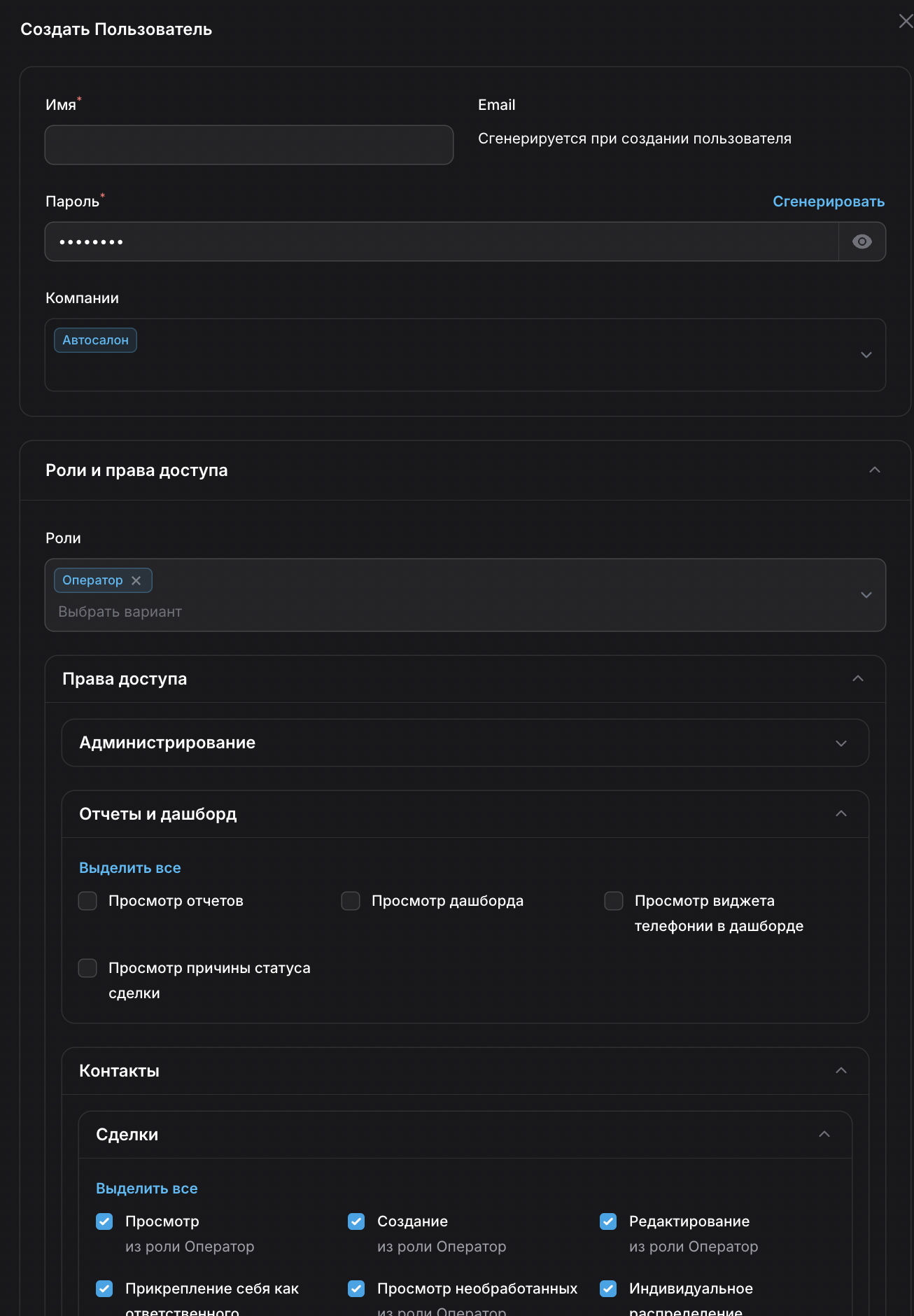 - Роль пользователя и набор прав доступа задаются автоматически, однако вы можете скорректировать их, руководствуясь названиями опций.