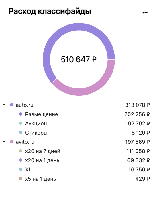 Виджет "Расходы по классифайдам" представляет собой круговую диаграмму, которая помогает отслеживать расходы, связанные с использованием классифайдов через CRM-систему. Этот инструмент идеально подходит для тех, кто активно работает с выгрузками и применяет различные услуги через CRM.
