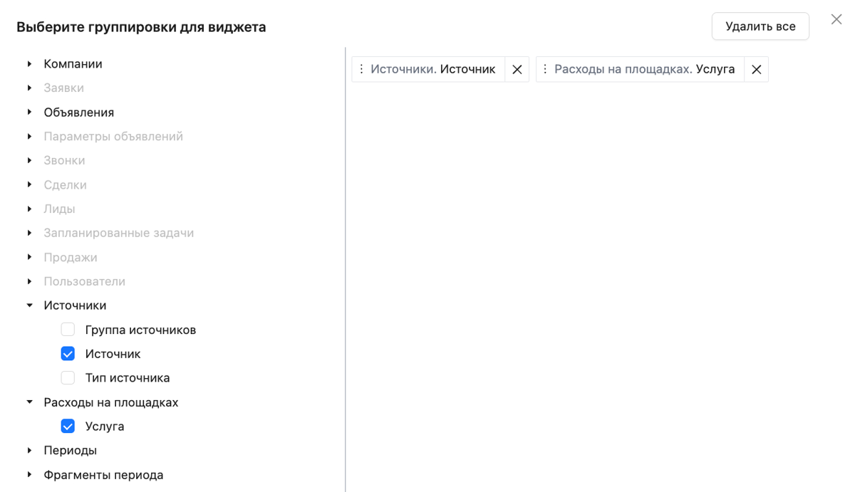 • Удобство анализа: Возможность просмотра конкретных услуг по каждому источнику упрощает управление затратами и планирование бюджета.