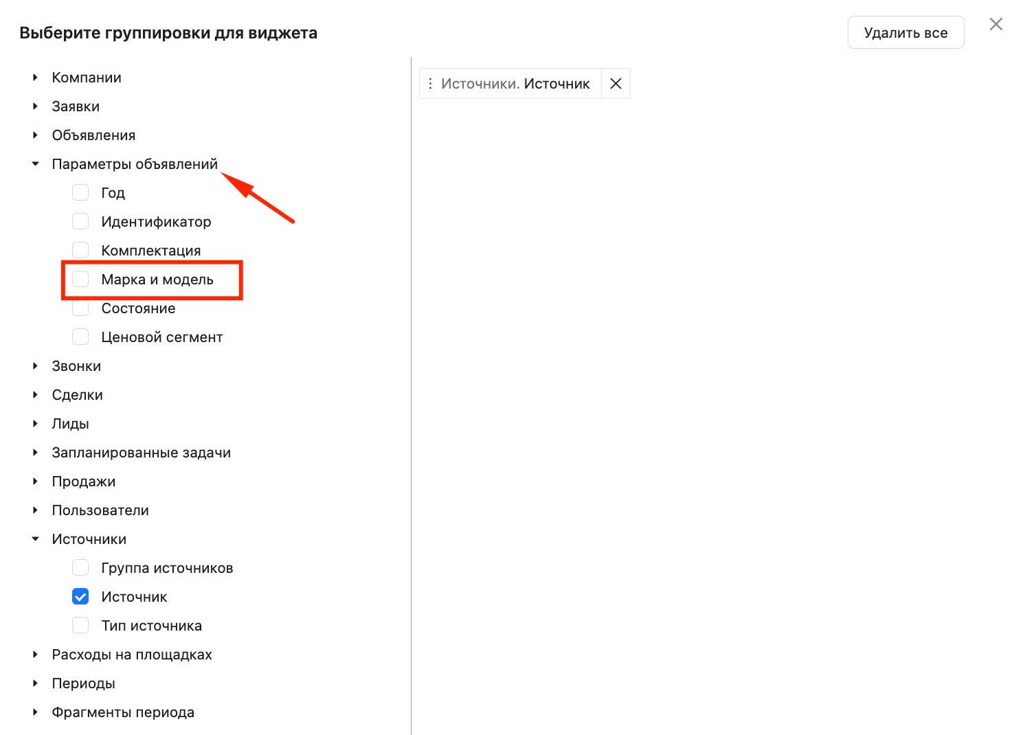 Чтобы добавить группировку "Марка и модель", в настройках виджета установите соответствующую группировку, которая будет выделена красным цветом (на скриншоте) для удобства настройки.