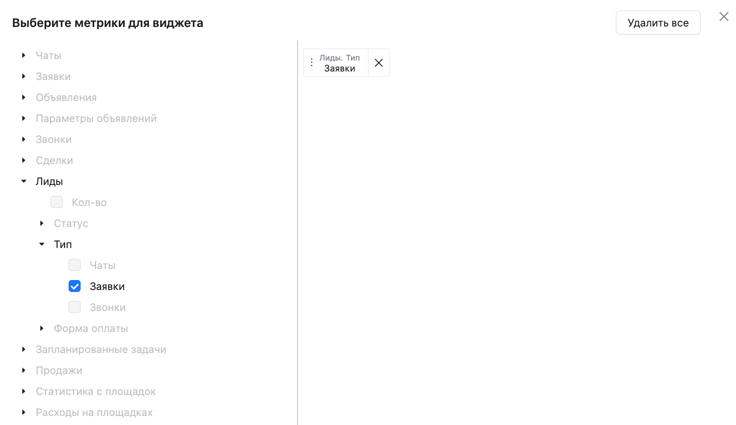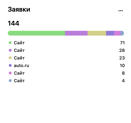 Этот виджет предлагает базовую функциональность с простыми настройками. Он автоматически отображает источники заявок в порядке убывания, с общим количеством заявок указанным под названием виджета.