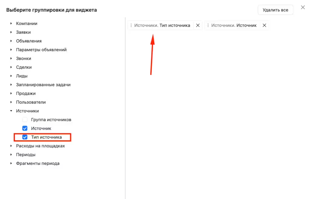 Чтобы изменить группировку на "Тип источника", установите галочку в соответствующем поле в настройках группировок. Если же вам необходимо отобразить источники последовательно без дополнительных групп, оставьте настройку "Источник".